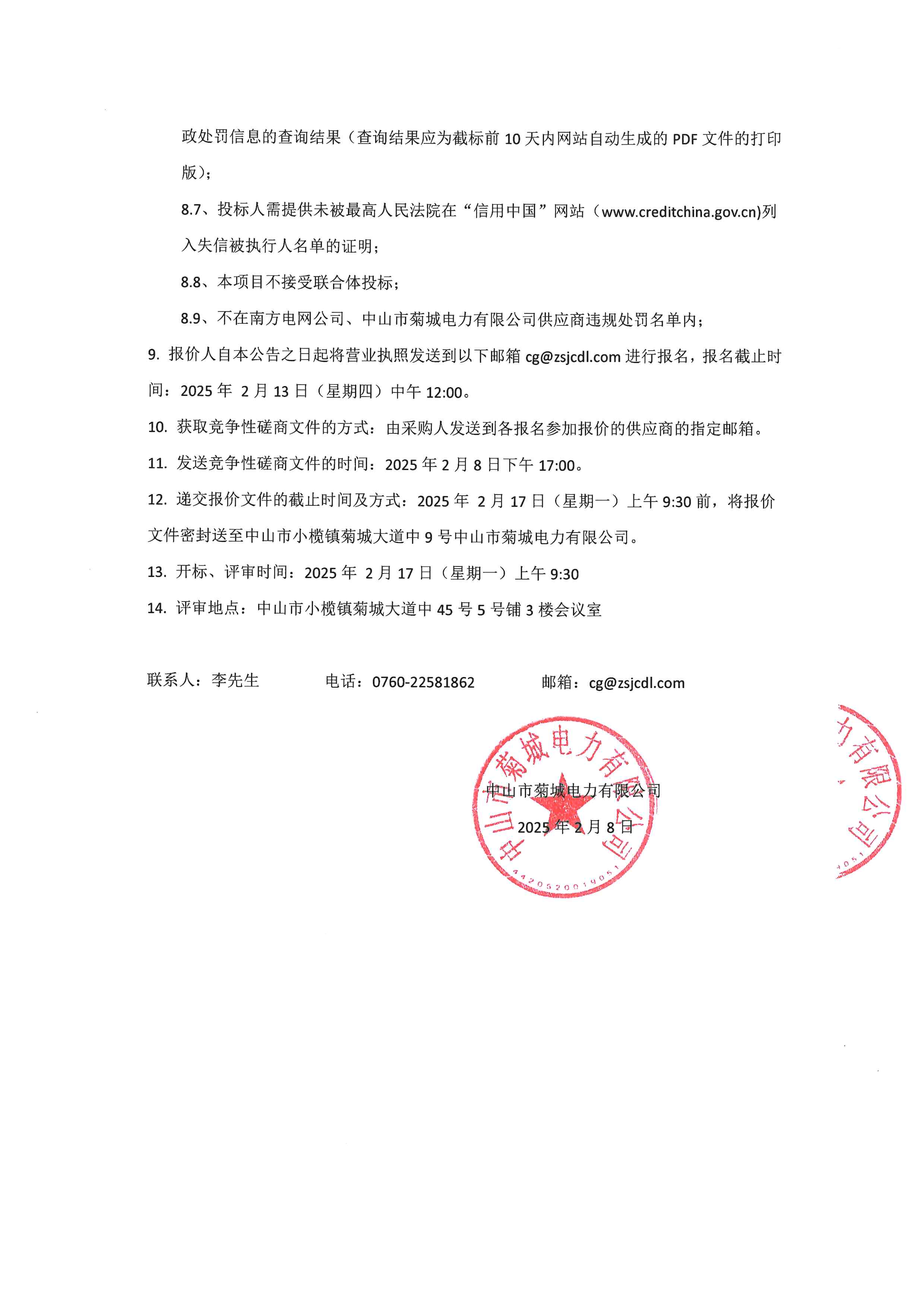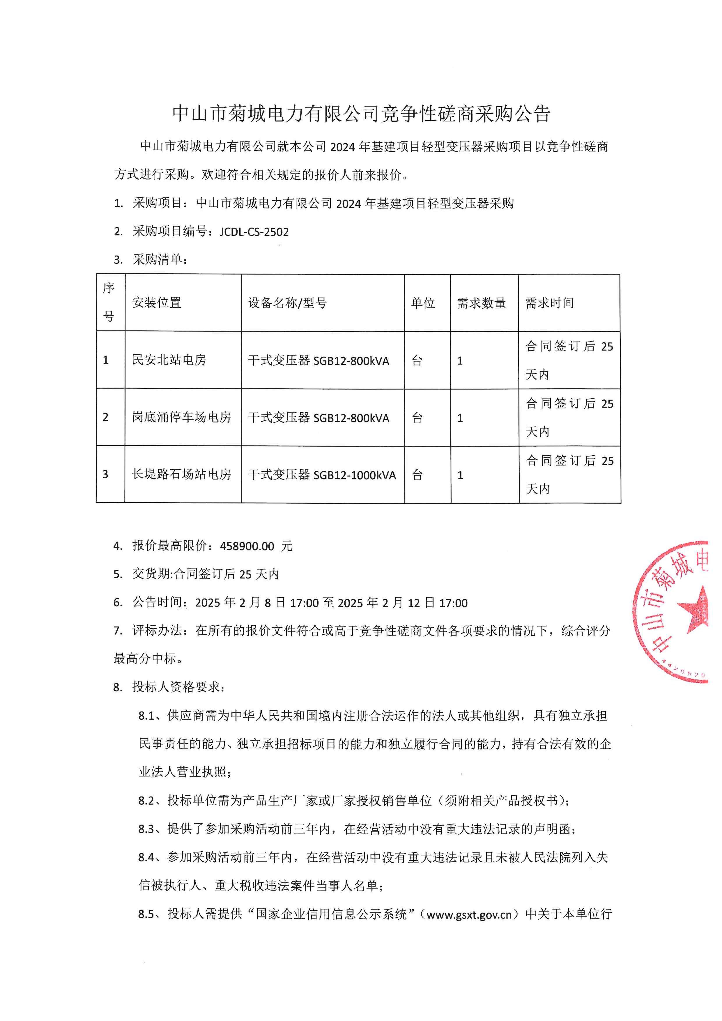 中山市菊城電力有限公司2024基建項目輕型變壓器競爭性磋商公告
