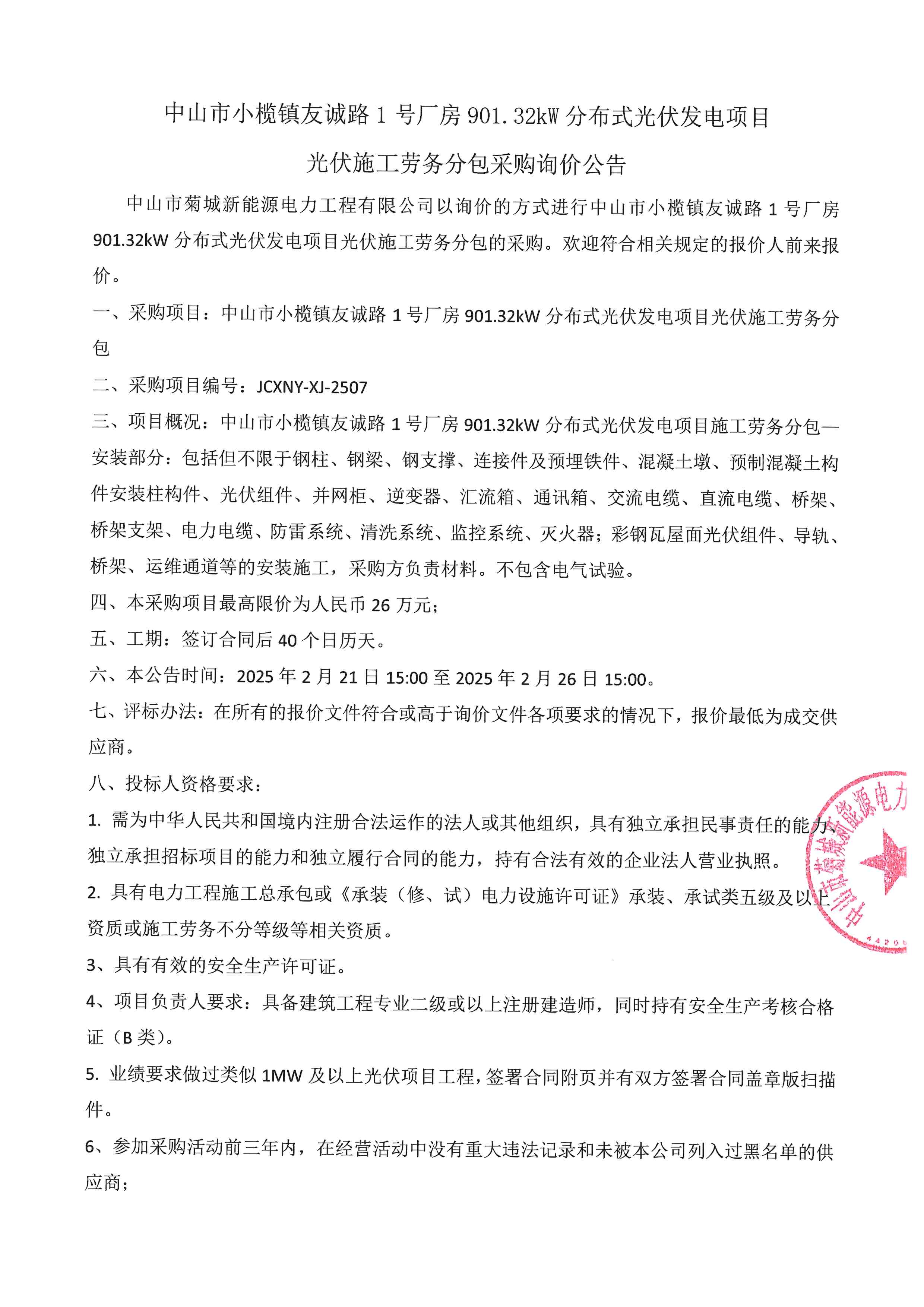中山市小欖鎮(zhèn)友誠路1號(hào)廠房901.32kW分布式光伏發(fā)電項(xiàng)目光伏施工勞務(wù)分包采購詢價(jià)公告