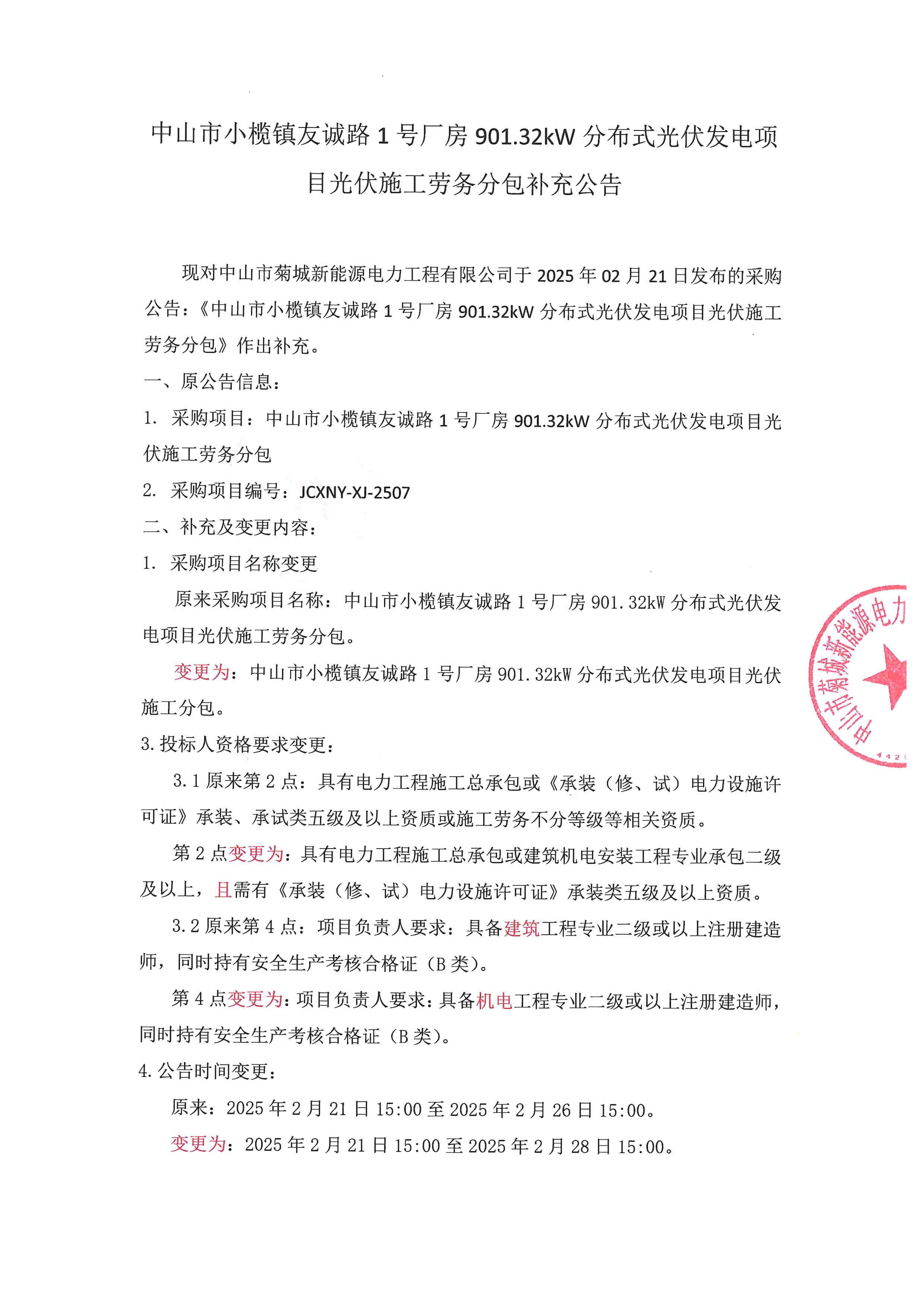 中山市小欖鎮(zhèn)友誠(chéng)路1號(hào)廠房901.32kW分布式光伏發(fā)電項(xiàng)目光伏施工分包采購(gòu)補(bǔ)充公告