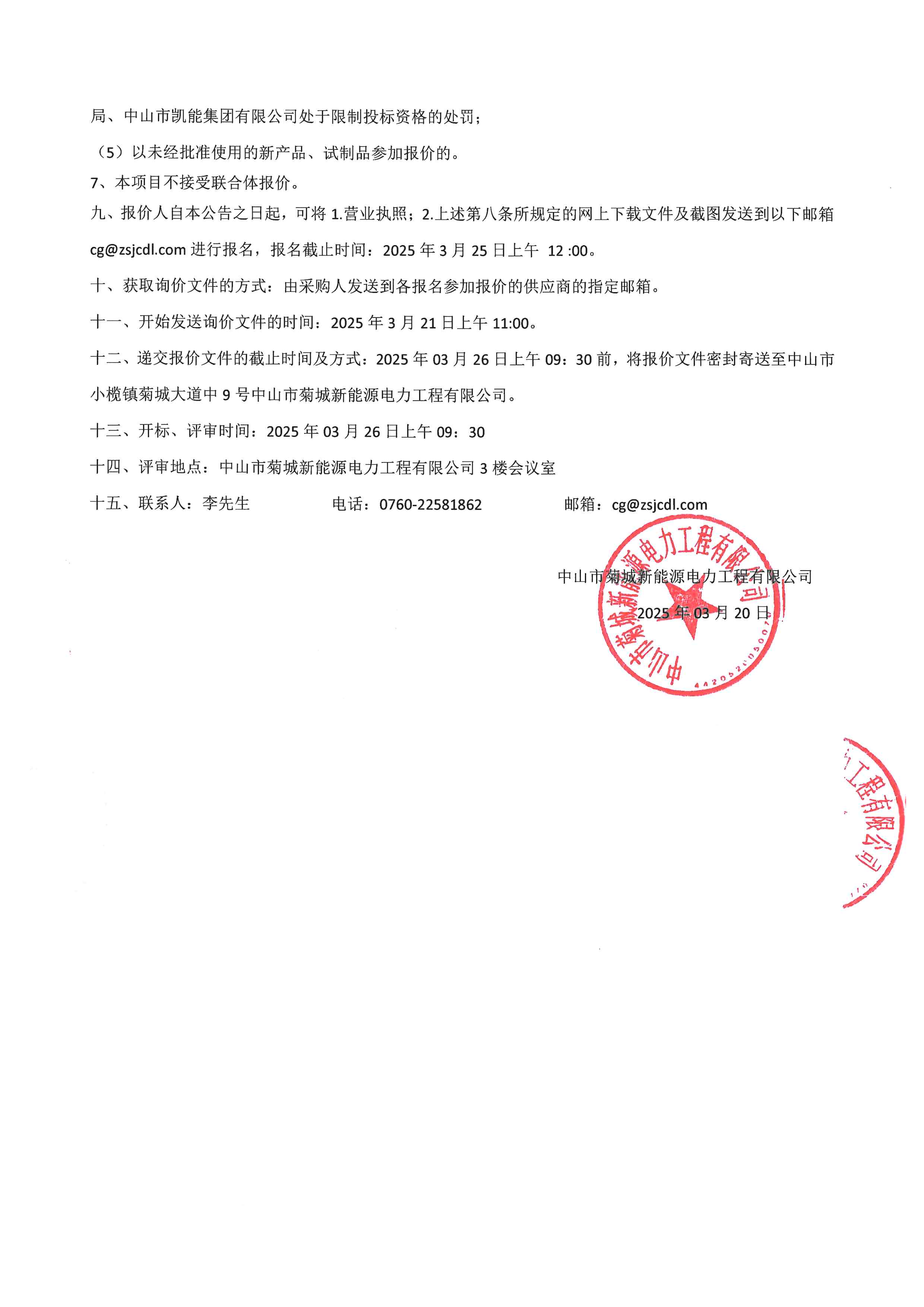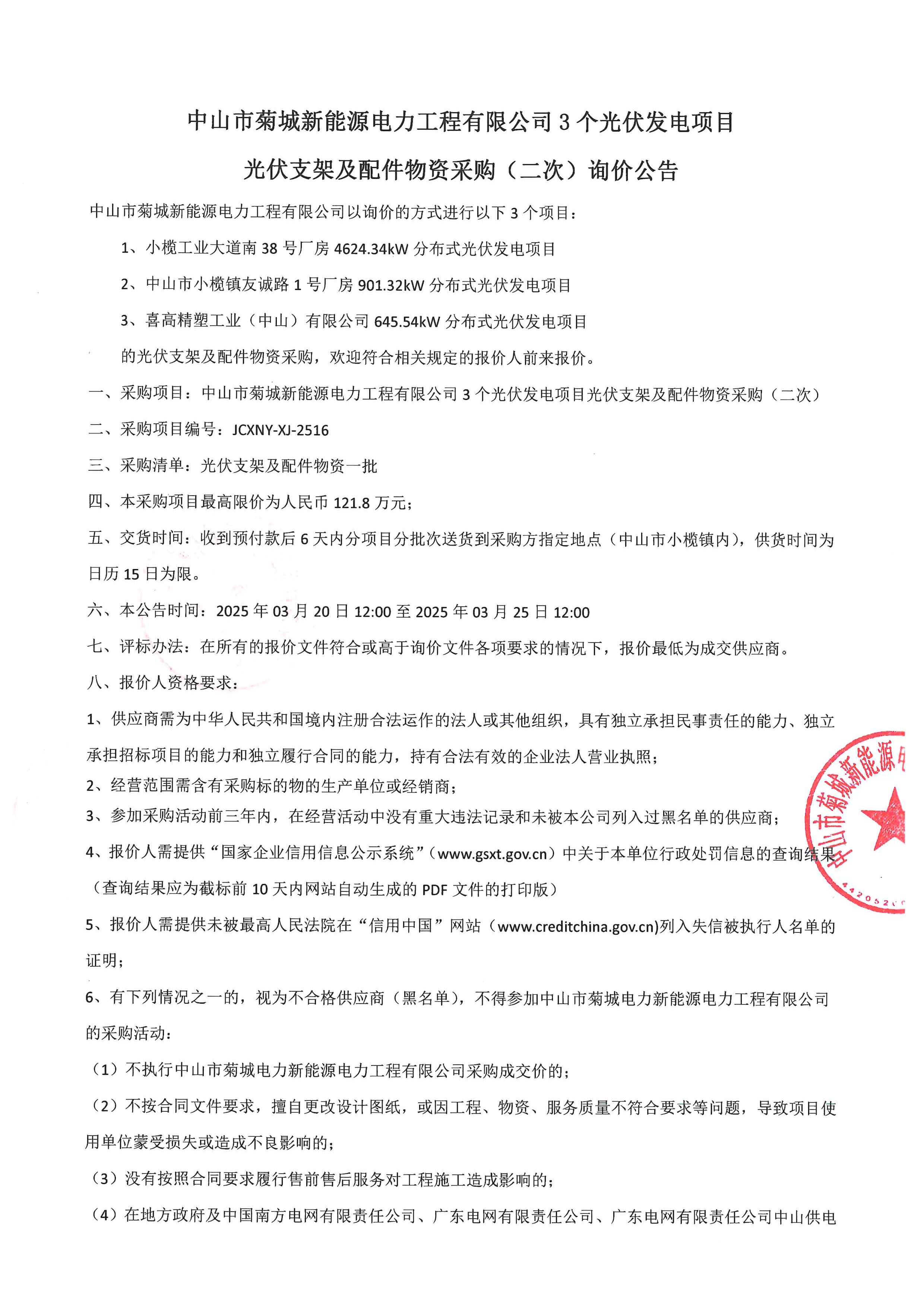 中山市菊城新能源電力工程有限公司3個光伏發(fā)電項目光伏支架及配件物資采購(二次)詢價公告