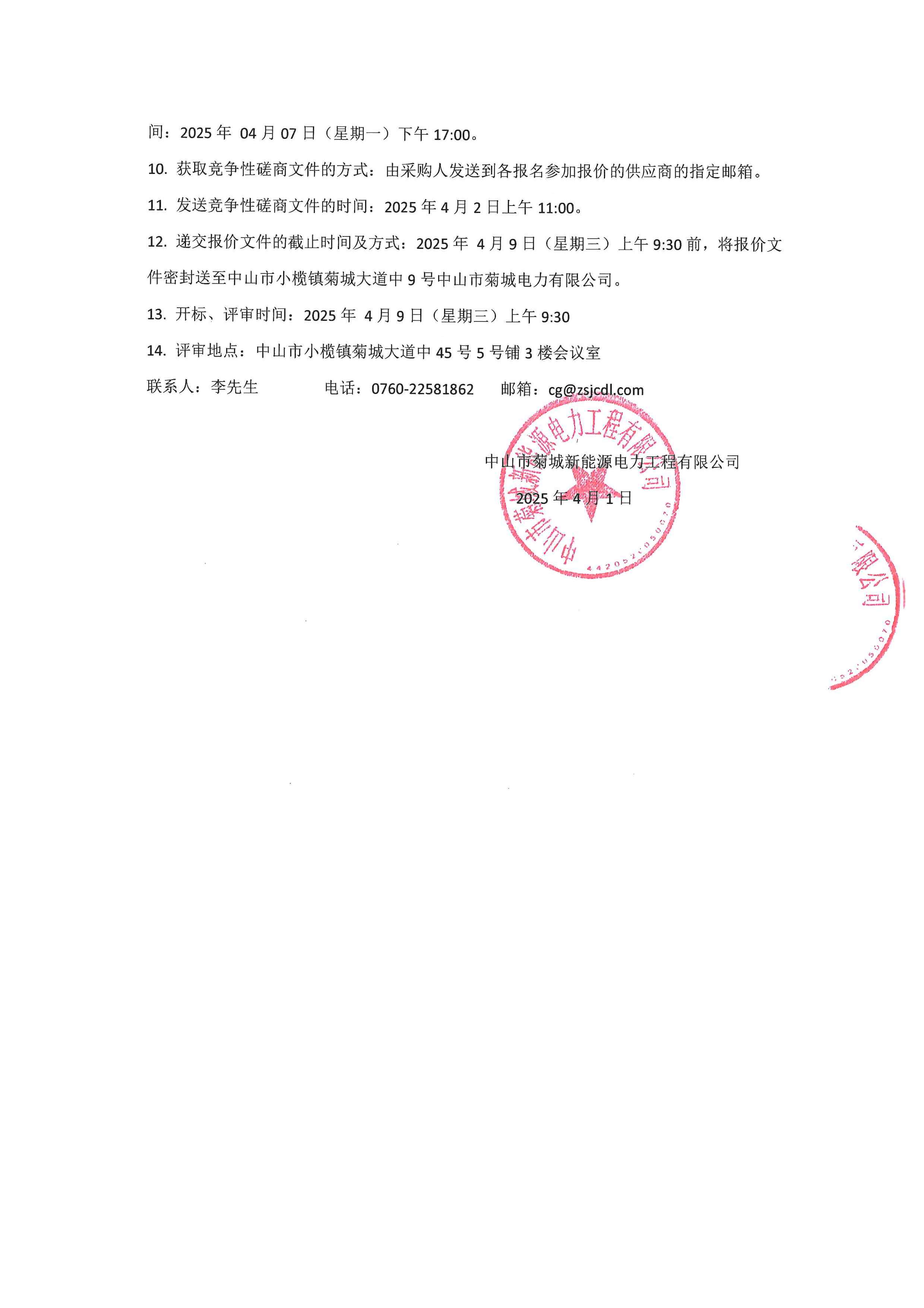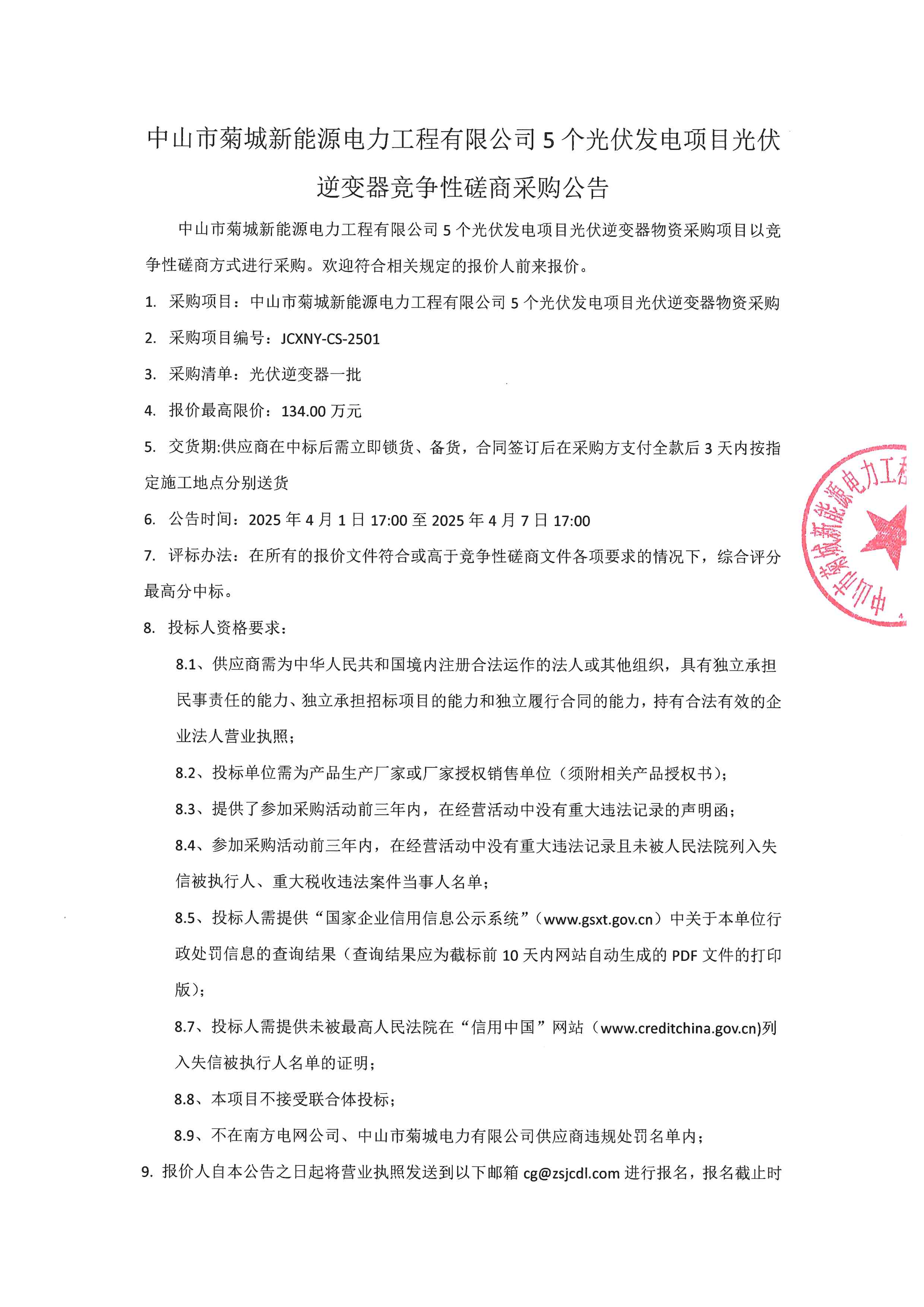 中山市菊城新能源電力工程有限公司5個光伏發(fā)電項目光伏逆變器競爭性磋商采購公告