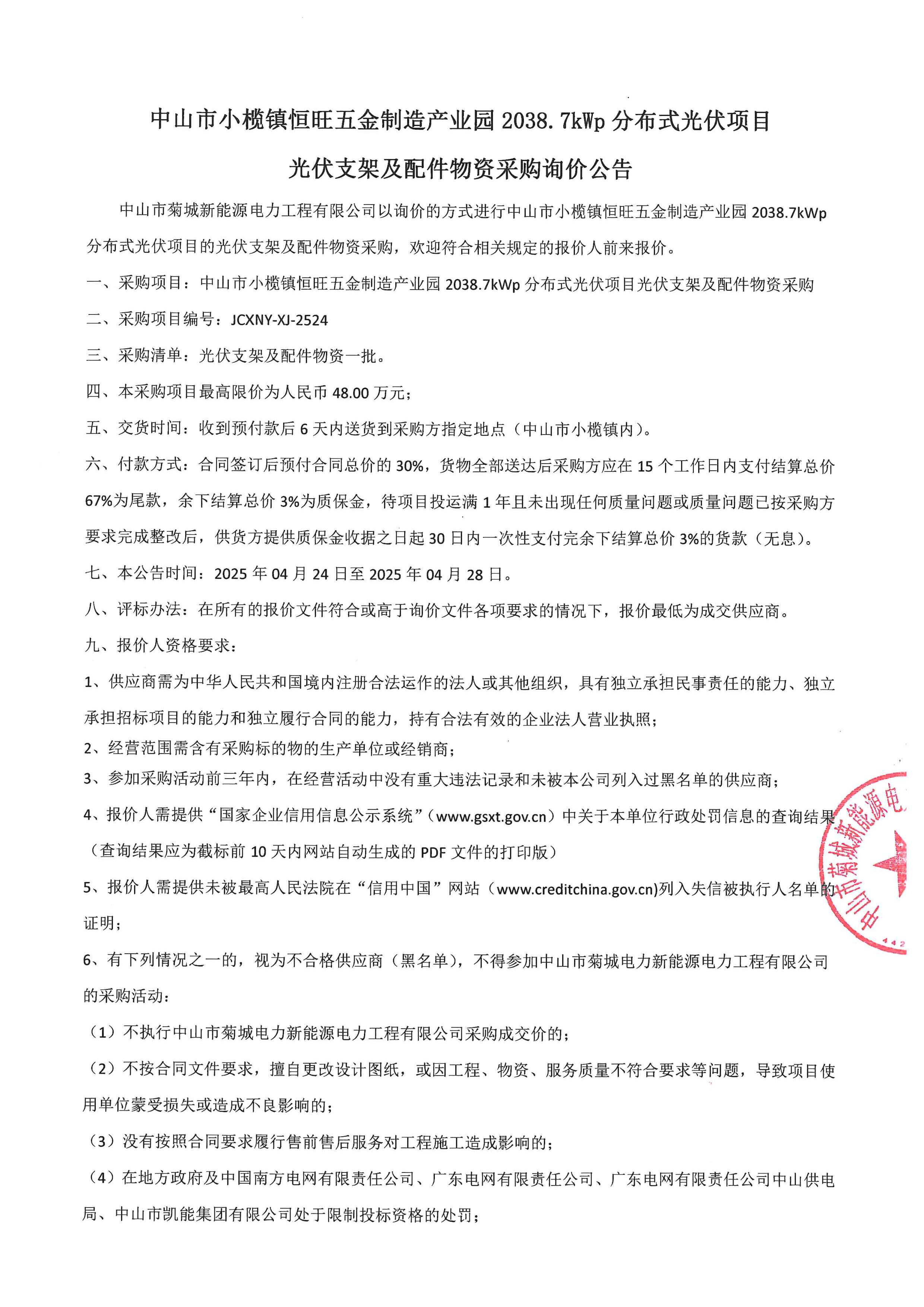中山市小欖鎮(zhèn)恒旺五金制造產(chǎn)業(yè)園2038.7kWp分布式光伏項(xiàng)目光伏支架及配件物資采購詢價公告
