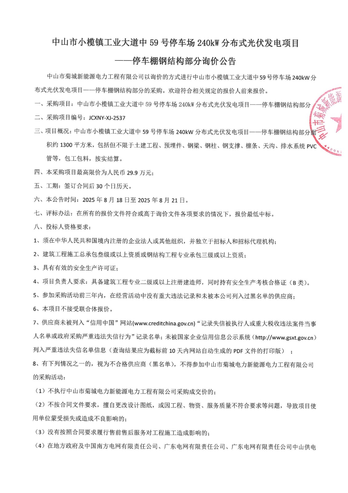 中山市小欖鎮(zhèn)工業(yè)大道中59號停車場240kW分布式光伏發(fā)電項目——停車棚鋼結(jié)構(gòu)部分詢價公告